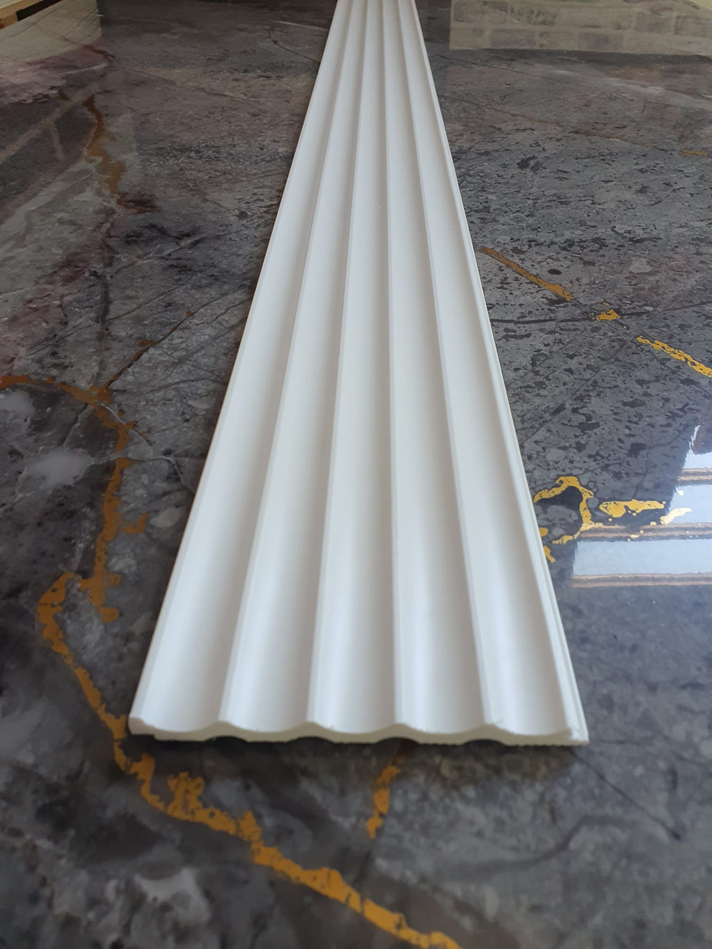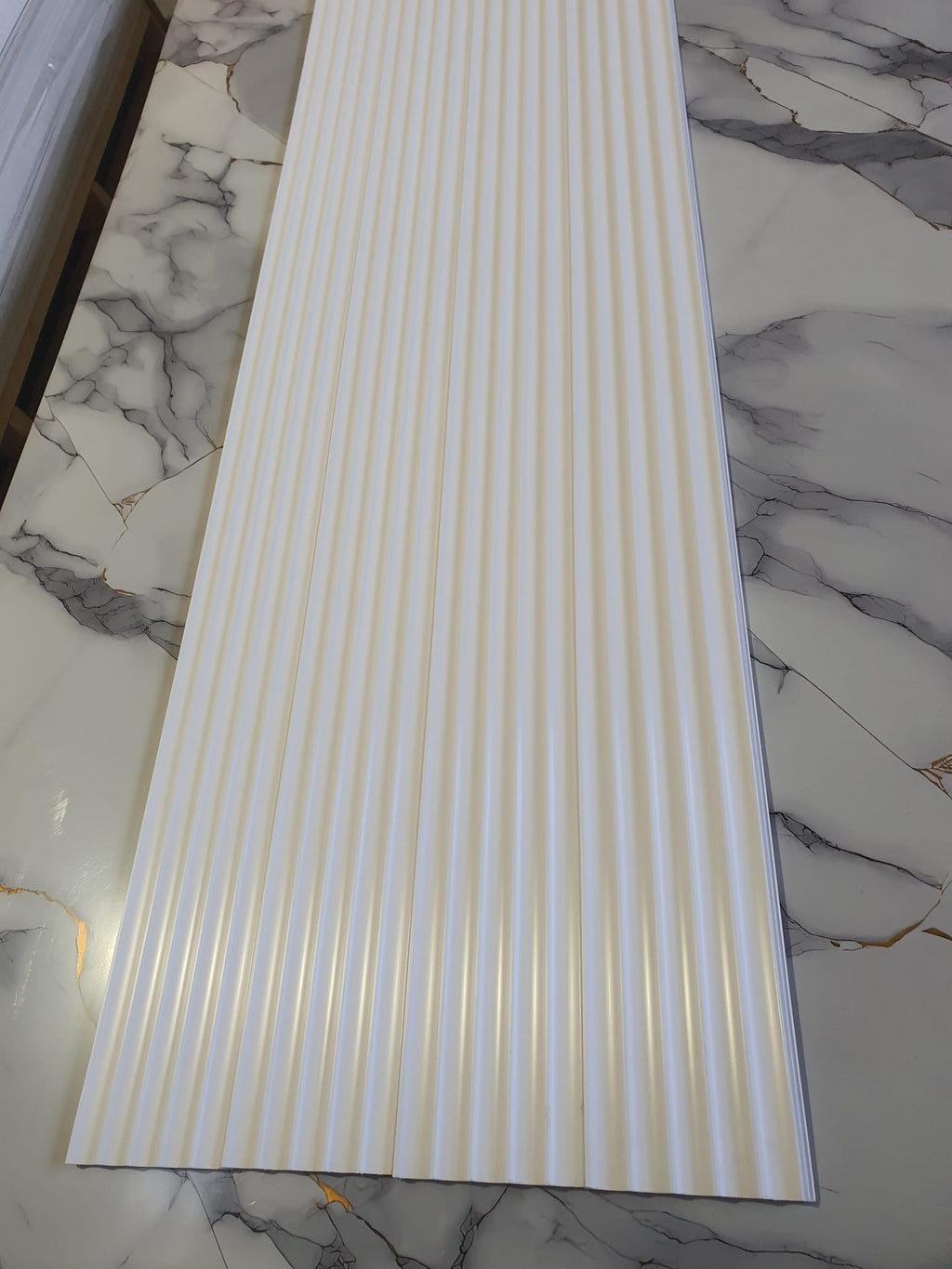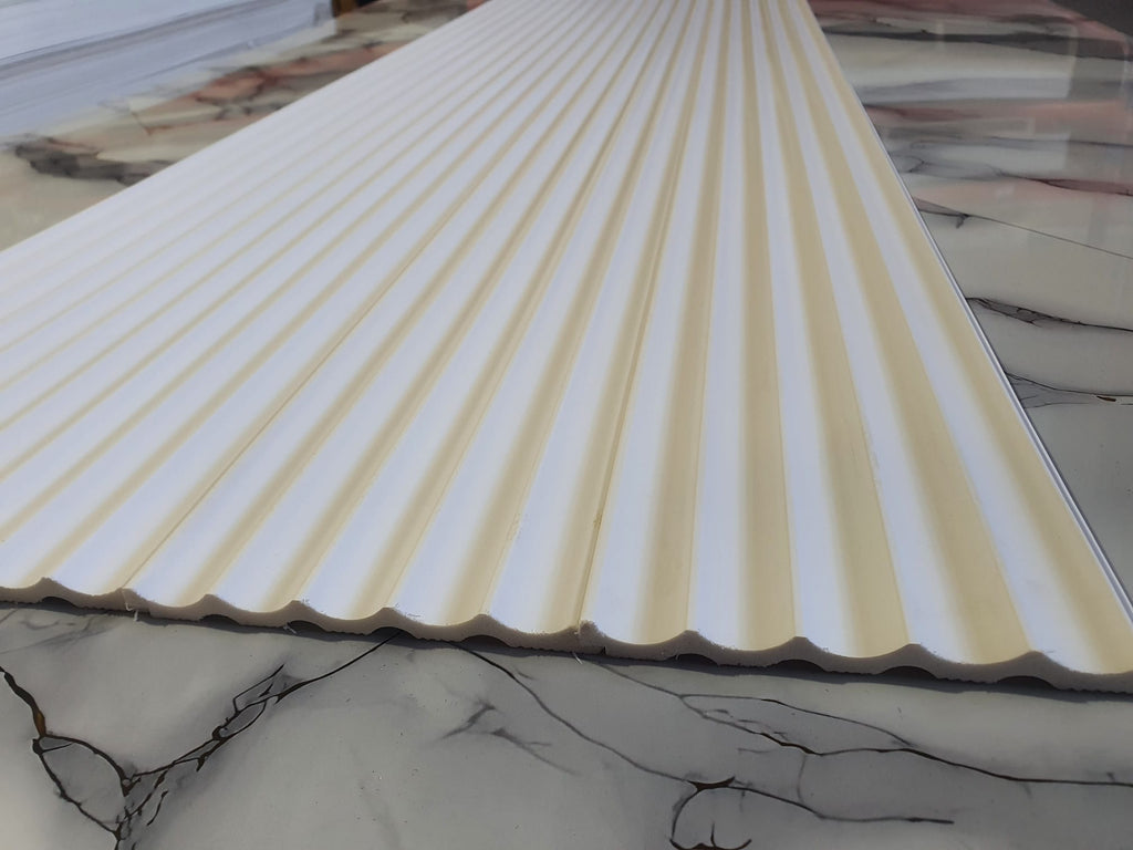 Panou decorativ tip riflaj pentru perete sau mobilier, alb, vopsibil. Este un profil decorativ din Polimer Dur, ceea ce il face potrivit pentru bai sau zonele care sunt expuse la umezeala.