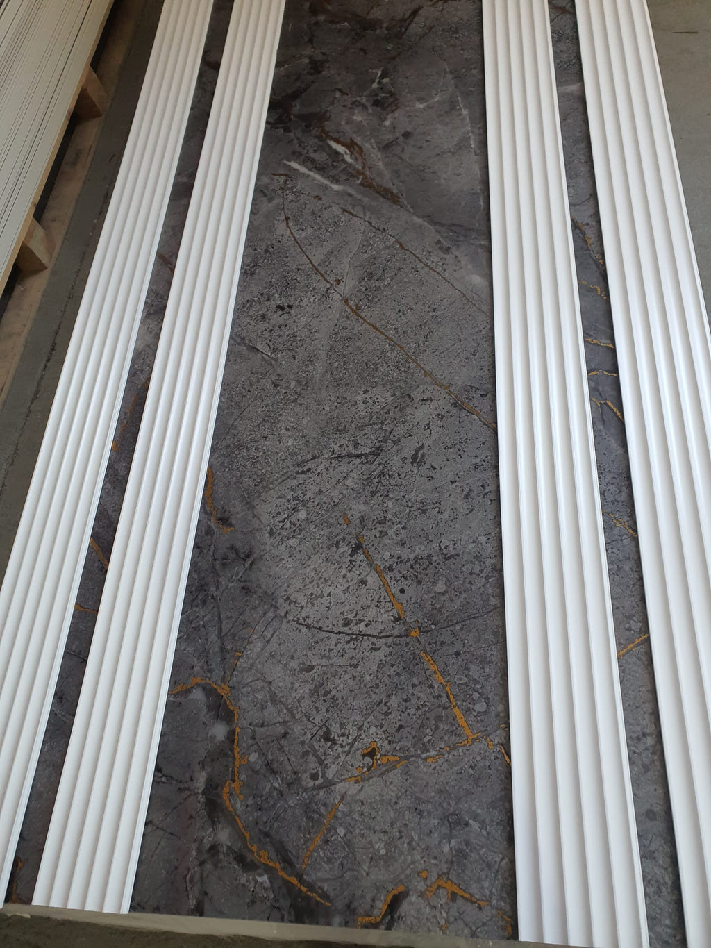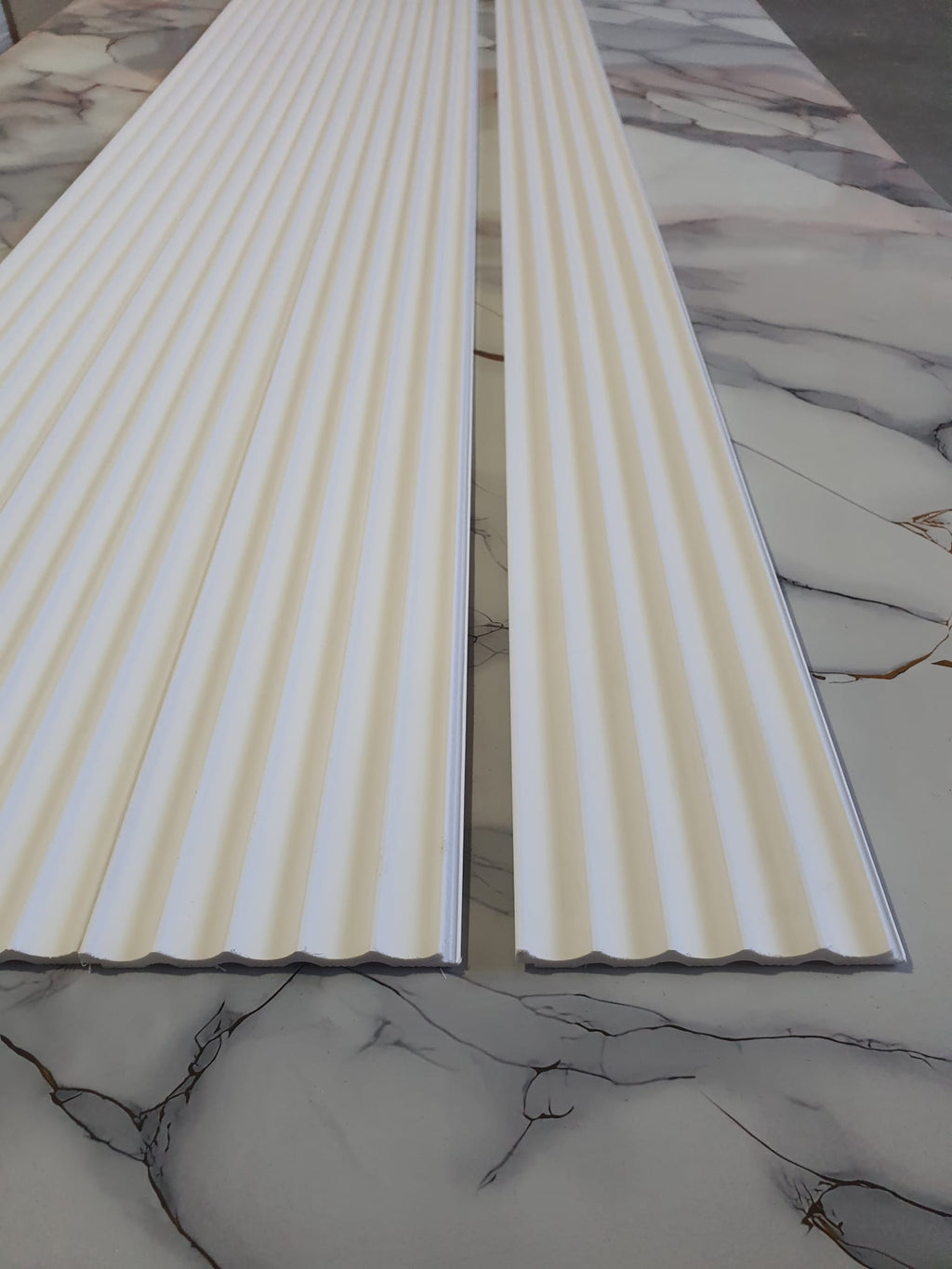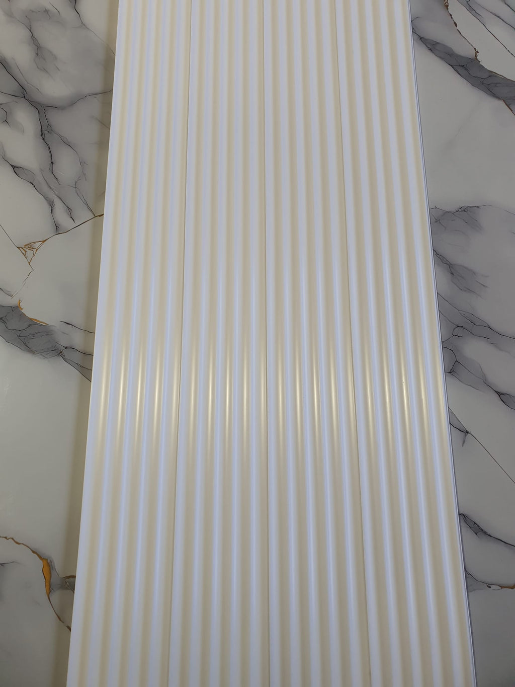 Panou decorativ tip riflaj pentru perete sau mobilier, alb, vopsibil. Este un profil decorativ din Polimer Dur, ceea ce il face potrivit pentru bai sau zonele care sunt expuse la umezeala.